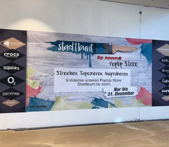 Im "Stadtbunt by toom" Pop-up-Store dreht sich drei Monate lang alles ums Streichen, Tapezieren und Renovieren: Das Store-Konzept richtet sich dabei an dem Farb- und Renovierungssortiment von Toom aus. Neben Farben, Lacken, Tapeten und Malerwerkzeugen der Eigenmarke "Toom" stehen außerdem die Trendfarbtöne der neuen Kollektion "Stiltalent by toom" im Mittelpunkt des Angebotes. Zusätzlich präsentiert Toom eine Auswahl des Lampensortiments aus derselben Kollektion "Stiltalent by toom". Darüber hinaus können DIY-Interessierte jeden Samstag das Sortiment unter fachkundiger Anleitung ausprobieren und ihre handwerklichen Fähigkeiten erweitern.