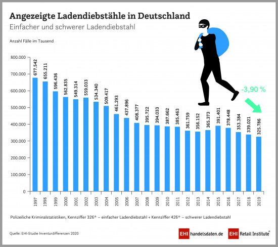 Auch wenn das Thema Diebstahl ein Dauerbrenner ist: 2019 sind die angezeigten Ladendiebstähle laut polizeilicher Kriminalstatistik um 3,9 Prozent auf insgesamt 325.786 Fälle zurückgegangen. Während die Zahl der einfachen Ladendiebstähle seit 1997 nahezu kontinuierlich gesunken ist, haben sich schwere Ladendiebstähle in den letzten dreizehn Jahren nahezu verdreifacht. Durch die hohe Dunkelziffer von über 98 Prozent besitzt die Statistik nur eine eingeschränkte Aussagefähigkeit.