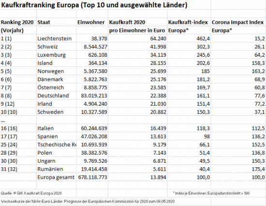 Wie viel Geld Verbraucher in den 42 untersuchten Ländern für Essen, Wohnen, Dienstleistungen, Energiekosten, private Altersvorsorge, Versicherungen, Urlaub, Mobilität oder auch Konsumwünsche zur Verfügung haben, unterscheidet sich von Land zu Land sehr. In Liechtenstein, der Schweiz und Luxemburg ist das verfügbare Nettoeinkommen am höchsten, während es im Kosovo, in Moldawien und der Ukraine am niedrigsten ist. So haben die Liechtensteiner mehr als das 37-Fache der Durchschnittskaufkraft der Ukrainer und das 4,6-Fache der Europäer im Durchschnitt. Auch alle anderen Länder in den Top 10 weisen eine sehr überdurchschnittliche Pro-Kopf-Kaufkraft auf, die mindestens 50 Prozent über dem europäischen Durchschnitt liegt. Neu in den Top 10 des Kaufkraftrankings ist in diesem Jahr Irland, das mit 21.030 Euro pro Kopf den neunten Platz belegt und damit Finnland aus den Top 10 verdrängt.