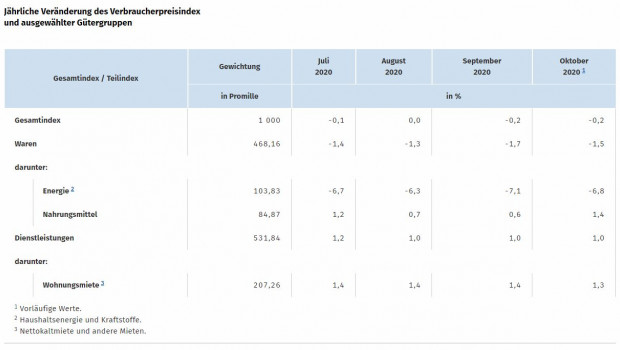 Inflationsrate im Oktober voraussichtlich minus 0,2 Prozent