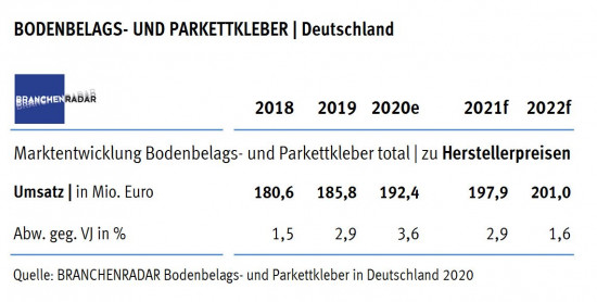 Der Markt für Bodenbelags- und Parkettkleber wächst 2020 in Deutschland um voraussichtlich 3,6 Prozent gegenüber dem Vorjahr auf insgesamt rund 192 Mio. Euro. Zu diesem Ergebnis kommt die aktuelle Studie des Marktforschungsinstituts Branchenradar.com zu Bodenbelags- und Parkettklebern.