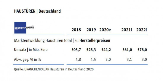 Auch in den beiden kommenden Jahren können die Hersteller von Haustüren laut den Autoren mit einem stabil wachsenden deutschen Markt rechnen. Bis 2022 prognostiziert Branchenradar.com Marktanalyse ein jährliches Wachstum der Erlöse von rund drei Prozent, sofern die Corona-Krise nicht dauerhafter und umfangreicher werde als aus heutiger Sicht angenommen.