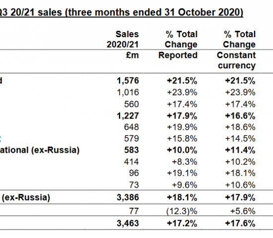 Insgesamt ist der Umsatz um 17,2 Prozent auf 3,463 Mrd. GBP gestiegen, währungsbereinigt um 17,6 Prozent, außerdem flächenbereinigt um 17,4 Prozent. Das währungsbereinigte Plus in den einzelnen Ländern: Großbritannien und Irland 21,5 Prozent, Frankreich 16,6 Prozent, Polen 10,2 Prozent, Spanien und Portugal 18,1 Prozent, Rumänien 10,6 Prozent, Russland 5,6 Prozent (s. ausführliche Tabellen unten).