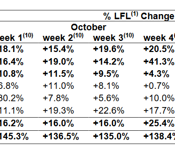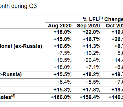 In den ersten beiden November-Wochen hat sich der flächenbereinigte Umsatzzuwachs leicht auf 12,6 Prozent abgeschwächt, was auf die Lockdowns in mehreren Ländern zurückzuführen ist, so das Unternehmen. Umgekehrt haben die Online-Verkäufe noch einmal weiter angezogen: um 144,2 Prozent in der ersten und um 155,9 Prozent in der zweiten November-Woche.