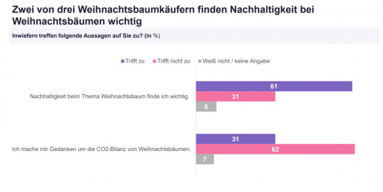Ein Fünftel (21 Prozent) der diesjährigen Weihnachtsbaumkäufer will den Baum in diesem Jahr von einem regionalen Landwirt beziehen. 13 Prozent aller Befragten erstehen ihn an Ständen vor Supermärkten. 8 Prozent wollen ihren Baum beim Förster kaufen oder selbst schlagen. Dass sie bereit wären, für einen nachhaltigen Weihnachtsbaum mehr Geld auszugeben, sagen 59 Prozent der diesjährigen Weihnachtsbaum-Käufer.