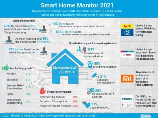 Aktuell nutzen 40 Prozent der Deutschen mindestens eine Smart-Home-fähige Anwendung. Weitere 38 Prozent zeigen sich daran interessiert, 22 Prozent lehnen eine Nutzung ab. Im Vergleich zur vergangenen Erhebung bedeutet dies sowohl eine Abnahme der nutzenden (2019: 46 Prozent) als auch der ablehnenden (2019: 26 Prozent) Personen. Das Hamburger Marktforschungsinstitut Splendid Research hat dazu im November 2020 im Rahmen einer repräsentativen Umfrage über sein Online-Panel www.befragmich.de 1.484 in Deutschland lebende Personen zwischen 18 und 69 Jahren befragt.