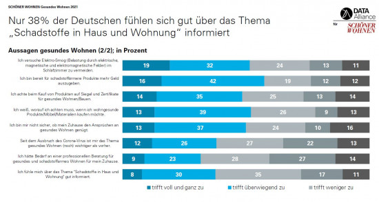 Die Hälfte der Teilnehmer ist sich unsicher, ob ihr Zuhause den Ansprüchen an gesundes Wohnen genügt (51 Prozent). Nur 38 Prozent fühlen sich über das Thema "Schadstoffe in Haus und Wohnung" gut informiert und sogar ein Drittel (32 Prozent) hätte Bedarf an einer professionellen Beratung für gesundes und schadstoffarmes Wohnen.