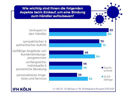 Obwohl der stationäre Einzelhandel sich seit elf Wochen im Lockdown befindet, haben Konsumenten im gesamten Verlauf der Pandemie eine stärkere Beziehung zu lokalen Händlern aufgebaut. Diese und weitere Daten liefert der aktuelle Corona Consumer Check des IFH Köln. So gab ein Viertel der Befragten an, eine stärkere Beziehung zu ihren bekannten, lokalen Händlern aufgebaut zu haben. Auch mit Onlineanbietern, bei denen bereits vor der Krise eingekauft wurde, fühlen sich 21 Prozent stärker verbunden. Ein besonders ausgeprägtes Bindungsempfinden ist bei den 18- bis 29-Jährigen zu beobachten.