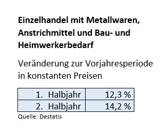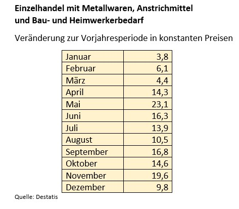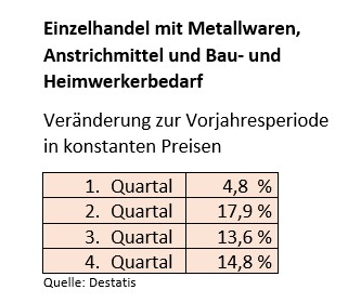 Das Statistische Bundesamt bestätigt die starken Umsatzzuwächse des DIY-Handels, die bereits in verschiedenen anderen Erhebungen genannt wurden. Laut vorläufigen Destatis-Zahlen hat der Einzelhandel mit Metallwaren, Anstrichmitteln und Bau- und Heimwerkerbedarf das Jahr 2020 mit einem Umsatzplus von real 13,2 Prozent abgeschlossen.