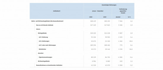 Die Gesamtzahl der Baugenehmigungen in Deutschland, sowohl für neue Gebäude als auch für Baumaßnahmen an bestehenden Gebäuden, stieg ebenfalls: Sie legte mit 368.400 um knapp 8.000 oder 2,2 Prozent gegenüber dem Jahr 2019 zu. Wie Destatis weiter mitteilt, befindet sich die Zahl genehmigter Wohnungen im Zeitvergleich weiter auf einem hohen Niveau. Mehr genehmigte Wohnungen als im Jahr 2020 gab es seit der Jahrtausendwende nur 2016 mit 375.400.