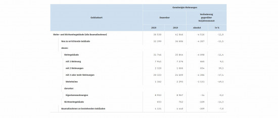 Im Dezember 2020 lag die Zahl der genehmigten Wohnungen mit 36.530 um 11 Prozent unter dem Wert des Vorjahresmonats. In neu zu errichtenden Wohngebäuden wurden in diesem Monat rund 11,5 Prozent weniger Wohnungen als im Dezember 2019 genehmigt. Dies ist vor allem auf den Rückgang von 17,4 Prozent bei der Zahl der Genehmigungen für Mehrfamilienhäuser zurückzuführen. Die Zahl der Baugenehmigungen für Einfamilienhäuser ist um 9,1 Prozent und die für Zweifamilienhäuser um 39,3 Prozent gestiegen.