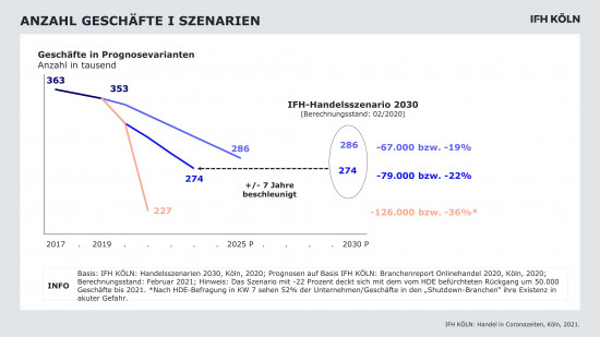 Pandemiebedingt beschleunigt sich der Strukturwandel im Handel um sieben bis acht Jahre. Das zeigen neue Zahlen von IFH Köln und Professor Dr. Werner Reinartz von der Universität zu Köln. Die Pandemie und die Digitalisierung haben demnach Kundenverhalten und Wettbewerbssituation maßgeblich beeinflusst. Die Geschwindigkeit, mit der Veränderungen im Markt sichtbar werden, habe drastisch zugenommen. Bis zum Jahr 2023 werden, den Autoren zufolge, bis zu einem Fünftel der stationären Läden ihre Türen schließen müssen – das sind bis zu 80.000 Geschäfte. Für das bestehende Jahr spanne sich die Situation kurzfristig zusätzlich durch liquiditätsbedingte Engpässe, die durch den Shutdown entstehen, weiter an.
