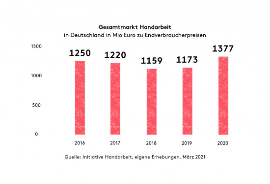 Die Handarbeitsbranche verzeichnet für das Jahr 2020 ein Umsatzplus von 17,4 Prozent, so der Branchenverband Initiative Handarbeit. Der Gesamtmarkt für Handarbeitsbedarf in Deutschland betrug demnach 1,38 Mrd. Euro, gemessen an Endverbraucherpreisen. Im Vorjahr waren es 1,17 Mrd. Euro. Der DIY-Boom spiegle die Entwicklung wider, dass die Menschen seit dem Frühjahr 2020 deutlich mehr Zeit Zuhause verbracht hätten, so der Verband weiter. „Handarbeit wurde wie Gärtnern, Heimwerken oder Brotbacken als eine Möglichkeit entdeckt, es sich in den eigenen vier Wänden schön zu machen und sich vom Alltag zu entspannen“, sagt Hedi Ehlen, Geschäftsführerin der Initiative Handarbeit. Hinzu kämen gesellschaftliche Entwicklungen wie der Wunsch nach mehr Nachhaltigkeit und Individualität. Das sprunghafte Marktwachstum mit diesem zweistelligen Plus ist aus Sicht des Branchenverbandes auf die Corona-Pandemie zurückzuführen.