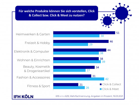 Der neue Corona Consumer Check des IFH Köln zeigt: Terminshopping wird noch wenig genutzt. Click & Collect ist bekannter (82 Prozent) und wird auch öfter in Anspruch genommen (17 Prozent). Click & Meet ist dagegen 75 Prozent der Befragten bekannt und nur acht Prozent haben bereits mit Termin geshoppt. Ein Vergleich der beiden Angebote in den verschiedenen Handelsbranchen zeigt: Der reine Abholservice Click & Collect überzeugt vor allem in den Sparten Heimwerken und Garten (51 Prozent) sowie Freizeit und Hobby (46 Prozent). Click & Meet ist unter anderem im Bereich „Wohnen und Einrichten“ für Konsumenten attraktiv. Beide Services werden von der jüngeren Zielgruppe der 18- bis 29-Jährigen deutlich besser angenommen.