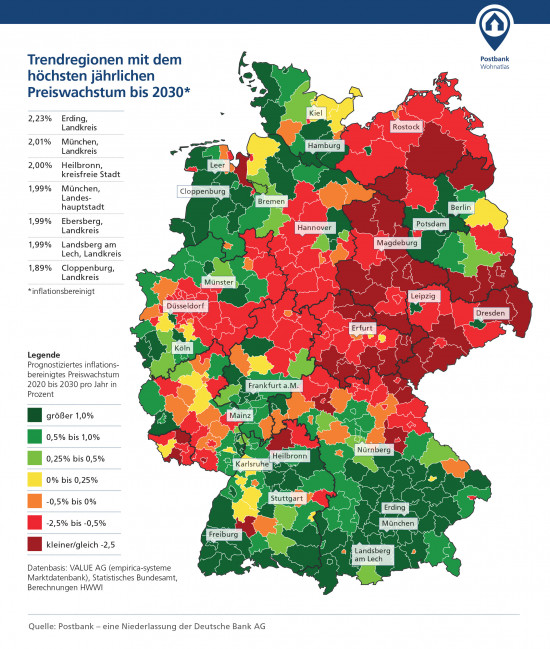 Zahlreiche große und mittlere Städte sind ebenso begehrt: Preissteigerungen von im Schnitt einem Prozent oder mehr pro Jahr bis 2030 werden neben Heilbronn und Potsdam laut Postbank-Prognose auch für die kreisfreien Städte Landshut, Baden-Baden, Dresden, Leipzig, Mainz, Ingolstadt und Freiburg im Breisgau erwartet.
