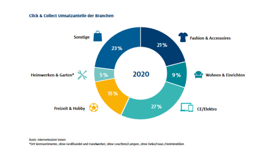 Die größten Umsatzanteile erzielten dabei Händler aus den Bereichen CE/Elektro (27 Prozent), Fashion und Accessoires (21 Prozent) sowie Freizeit und Hobby (15 Prozent). Der Handel im Bereich Heimwerkern und Garten hat 5 Prozent seines Umsatzes per Click & Collect erzielt. „Click & Collect kann auch nach Corona weiterhin eine gute Rolle spielen“, so Tromp. Daten aus dem HDE-Online-Monitor zeigen, dass sich knapp 60 Prozent der Kunden, die den Service schon einmal genutzt haben, das auch für normale Zeiten ohne Lockdown vorstellen können.