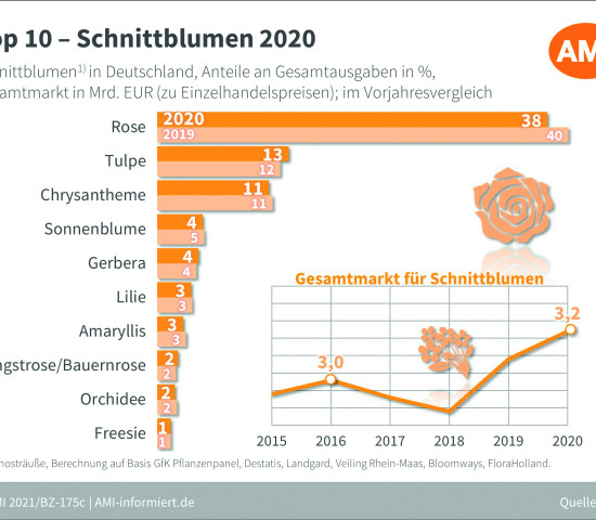 Bei den importlastigen Schnittblumen stieg das Marktvolumen um 4,2 Prozent auf rund 3,2 Mrd. Euro. Somit gab jeder Einwohner in Deutschland im Schnitt fast 38,70 Euro für Schnittblumen aus. Mit einem Anteil von 38 Prozent der (Verbraucher-)Ausgaben verlor die Rose zwar deutlich zum Vorjahr, ist aber noch mit weitem Abstand die meistgekaufte Schnittblume.
