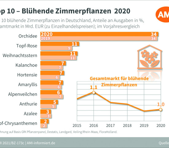 Der Zimmerpflanzenmarkt zeigte 2020 ein Wachstum von 3,5 Prozent zum Vorjahr auf. Der Marktanteil lag somit bei rund 1,57 Mrd. Euro. Bei den blühenden Zimmerpflanzen lag das Wachstum bei 0,6 Prozent mit rund 1,04 Mrd. Euro. Die grünen Zimmerpflanzen wuchsen deutlich stärker um 9,6 Prozent auf knapp 0,53 Mrd. Euro.