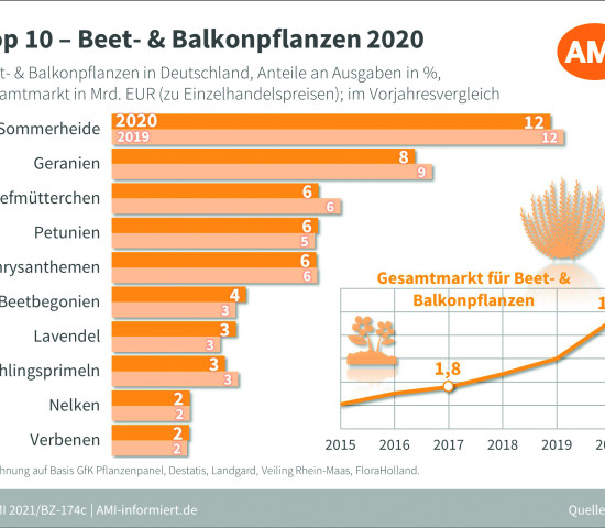 Beet- und Balkonpflanzen waren im Jahr 2020 sehr beliebt. Der Markt wuchs um 4,3 Prozent auf mehr als 1,9 Mrd. Euro. Pro Kopf gaben die Deutschen mehr als 23 Euro dafür aus. Dabei wurden die Pflanzen oftmals nach Verfügbarkeit gekauft und die Ausgaben für viele kleinere Kulturen stiegen, viele der Bestseller verloren hingegen. Das gilt auch für die Sommerheide, die aber noch immer die Top 10 mit 12 Prozent Anteil an den Ausgaben anführt. Die Geranie fiel auf etwas über 8 Prozent zurück. Stiefmütterchen und Frühlingsprimeln verloren deutlich, die Gänseblümchen verschwanden ganz aus der Top 10. Die Sommerpflanzen wie Petunien konnten Plätze gut machen. Manche blieben stabil im Markt, wie etwa die Chrysanthemen. Beetbegonien, aber auch Lavendel steigerten die Ausgabenanteile etwas.