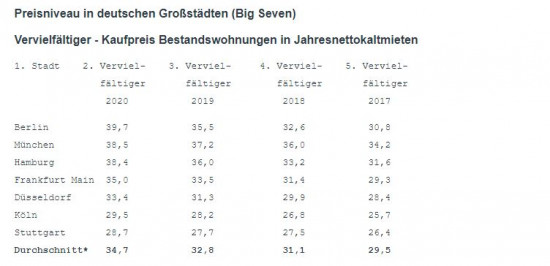 Besonders rasch enteilen die Kaufpreise in den sieben größten deutschen Städten dem Mietniveau. Im Vergleich zum Vorjahr liegt das Plus im Schnitt bei zwei Jahresmieten. Knapp 40 Jahresmieten mussten die Berliner im Jahr 2020 für den Kauf einer Wohnung berappen. Damit erreicht die Bundeshauptstadt einen der deutschlandweit höchsten Werte und mit einem Plus von rund vier Jahresmieten im Vergleich zum Vorjahr den stärksten Anstieg unter den sieben größten Städten. Wesentliche Ursache für diese Dynamik war der Berliner Mietendeckel, der ab Februar 2020 galt und im April 2021 vom Bundesverfassungsgericht gekippt wurde.