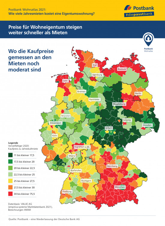 Im Jahr 2020 mussten Käufer durchschnittlich 25,7 Jahresnettokaltmieten für den Erwerb einer Wohnung aufbringen, 2019 waren es noch 24. Damit sind die Kaufpreise erneut stärker gestiegen als die Mieten. Dies sind Ergebnisse des Postbank-Wohnatlas, für den das Hamburgische Weltwirtschaftsinstitut die Wohnungsmärkte in deutschen Landkreisen und kreisfreien Städten untersucht hat. Die Dynamik beschleunigt sich. „Wir erwarten hinsichtlich des Immobilienbooms der vergangenen Jahre durch die Corona-Pandemie keine Trendumkehr. Allenfalls regional könnten pandemiebedingte Konjunktureinbrüche in bestimmten Branchen zu Anpassungen führen, wenn die verfügbaren Einkommen der privaten Haushalte stark in Mitleidenschaft gezogen werden sollten. Das würde die Nachfrage nach Wohnraum abschwächen“, sagt Eva Grunwald, Leiterin Immobiliengeschäft bei der Postbank.