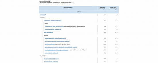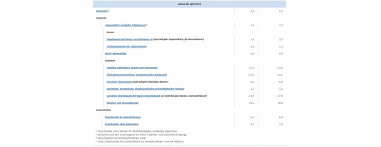 Im gesamten Einzelhandel mit Nicht-Lebensmitteln meldeten die Statistiker deutliche Steigerungen: Hier waren die Umsätze im April 2021 real 10,6 Prozent und nominal 11,3 Prozent höher als im Vorjahresmonat. Rechnet man den Lebensmittelhandel dazu, haben die Einzelhandelsunternehmen in Deutschland im April 2021 kalender- und saisonbereinigt real 5,5 Prozent und nominal 5,4 Prozent weniger umgesetzt als im März 2021. Ursächlich für den Rückgang dürften laut Destatis die Bundes-Notbremse in der zweiten Aprilhälfte sowie das Ostergeschäft im März 2021 gewesen sein. Im März 2021 war gegenüber dem Vormonat noch ein starkes Umsatzplus (kalender- und saisonbereinigt real 7,7 Prozent und nominal 7,6 Prozent) verzeichnet worden. Im Vergleich zum Vorkrisenmonat Februar 2020 war der Umsatz im April 2021 kalender- und saisonbereinigt real 0,8 Prozent niedriger. Gegenüber dem Vorjahresmonat April 2020 stieg der Einzelhandelsumsatz im April 2021 real um 4,4 Prozent und nominal um 5,8 Prozent.