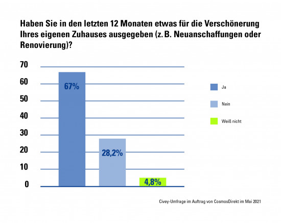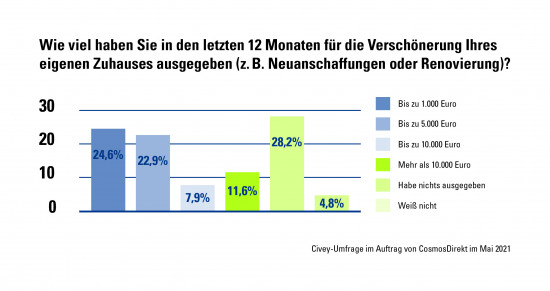 Zwei Drittel (67 Prozent) der Deutschen haben in den vergangenen zwölf Monaten Geld für die Verschönerung ihres Zuhauses ausgegeben, zum Beispiel für Neuanschaffungen oder Renovierungen. Das ergab eine aktuelle Civey-Umfrage im Auftrag von Cosmos Direkt, dem Direktversicherer der Generali in Deutschland. 24,6 Prozent der Umfrageteilnehmer gaben insgesamt bis zu 1.000 Euro aus, 22,9 Prozent steckten bis zu 5.000 Euro in die Verschönerung der eigenen vier Wände. Für 7,9 Prozent der Befragten lag die Investitionsgrenze bei 10.000 Euro und für immerhin noch 11,6 Prozent war ein schönes Zuhause mehr als 10.000 Euro wert.