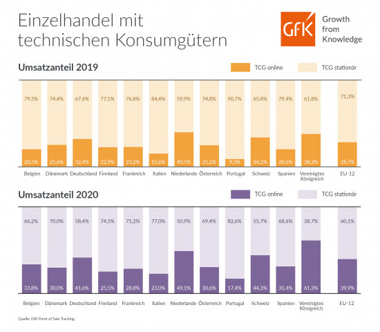 In zwölf westeuropäischen Staaten wurden fast 40 Prozent des Umsatzes mit technischen Konsumgütern im Jahr 2020 online getätigt. Die größten Gewinner waren die Click-and-Mortar-Händler, die ihren Onlineumsatz mit einem Wachstum von 60 Prozent wesentlich stärker steigern konnten als der reine Onlinehandel (+36 Prozent) und nun erstmals einen Anteil von mehr als 50 Prozent an allen Onlineumsätzen erreichen konnten.