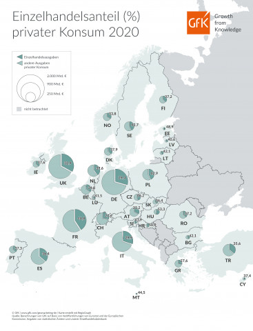 In der kostenfreien Studie „Einzelhandel Europa“ hat der Bereich Geomarketing der GfK die Schlüsselindikatoren des europäischen Einzelhandels für das Jahr 2020 untersucht. Die wichtigsten Ergebnisse im Überblick: