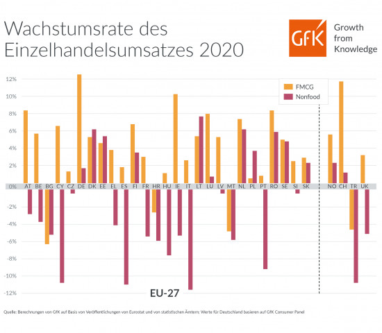 Der FMCG-Einzelhandel konnte 2020 in den EU-27-Staaten ein Umsatzwachstum von 5,5 Prozent verzeichnen. Dies ist unter anderem darauf zurückzuführen, dass der Nahrungsmittelkonsum aufgrund von geschlossenen Kantinen, Restaurants und allgemeinen Ausgangssperren in die eigenen vier Wände verlagert wurde. Die stärksten Zuwächse gab es in Deutschland (+12,4 Prozent), Irland (+10,3 Prozent), Österreich (+8,4 Prozent) und Luxemburg (+8,0 Prozent). Der Handel mit Gütern des nichttäglichen Bedarfs ging hingegen EU-weit um 3,0 Prozent zurück.