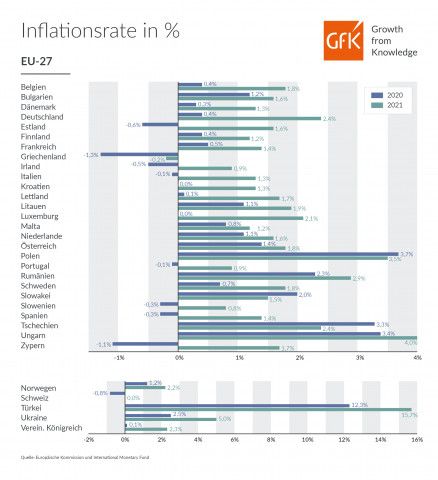 Nachdem die Inflation 2020 bei nur 0,7 Prozent lag, was unter anderem auf den stark gesunkenen Ölpreis zurückzuführen ist, wird für 2021 ein Anstieg der Inflationsrate auf 1,9 Prozent erwartet. Besonders deutlich sollte der Anstieg der Inflation in Deutschland ausfallen, wo mit dem Jahreswechsel die temporäre Reduktion der Mehrwertsteuer auslief. Hier wird für 2021 ein Preisanstieg von 2,4 Prozent erwartet, nach 0,4 Prozent im Vorjahr.