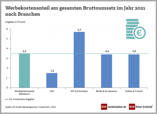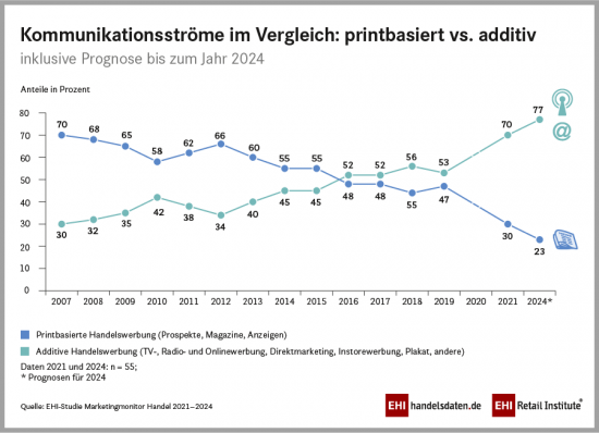 43 Prozent der befragten Marketingverantwortlichen gaben an, dass sich ihre Ausgaben für Werbemaßnahmen erhöht hätten oder gleichgeblieben seien. Rund 56 Prozent haben weniger Budget zur Verfügung. Da gedruckte Maßnahmen in aller Regel kostenintensiver seien und zudem eine hohe Vorlaufzeit benötigten, so das EHI, stehe das Prospekt erstmals an zweiter Stelle im Ranking der Marketingmaßnahmen. Gut 30 Prozent des Bruttowerbeaufkommens fließen in spezifische Handelsmedien wie Prospekte, Handzettel, Flyer oder Anzeigen. Knapp 34 Prozent der Ausgaben stehen für digitale Medien wie SEO, Social Media oder digitale Prospektportale bereit. In der Prognose für 2024 steigen digitale Medien nach Einschätzung der Forscher um vier Prozentpunkte in ihrer Bedeutung, während spezifische Handelsmedien um sieben Prozentpunkte verlieren.
