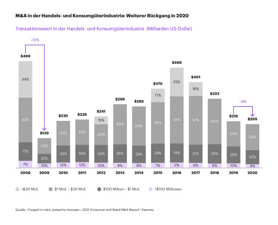Im ersten Pandemiejahr haben die Transaktionen in der Handels- und Konsumgüterbranche einen historischen Tiefstand erreicht, wie der M&A-Bericht 2021 der Managementberatung Kearney zeigt. 2020 lag er bei 205 Mrd. US-Dollar im Vergleich zu 496 Mrd. US-Dollar in 2016, relativ zum vergangenen Jahr ist er um sechs Prozent abgesackt. „Fusionen und Übernahmen folgen neuen Strategien: Alles wird der Nähe zu den Verbrauchern untergeordnet, die Unternehmen werden regionale, schnelle und agile Geschäftsmodelle anstreben, die ihnen größtmögliche Nähe zu ihren Kunden erlauben“, sagt Dr. Mirko Warschun, Leiter der Kearney-Handels- und Konsumgütersparte. M&A steht für Mergers & Acquisitions und ist ein Sammelbegriff für Transaktionen im Unternehmensbereich wie Fusionen von Gesellschaften und Unternehmensverkäufe.