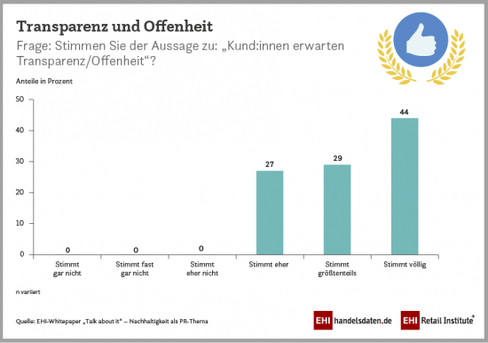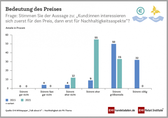 Die Handelsunternehmen gehen davon aus, dass Verbraucher von ihnen erwarten, gesellschaftliche Verantwortung zu übernehmen, darüber sind sich 94 Prozent einig. Auch unabhängige Kontrollinstanzen setze die Kundschaft voraus, meinen die Händler, allerdings mit etwas weniger Zustimmung von 85 Prozent – ähnlich wie im Vergleichsjahr. 2015 waren gut 90 Prozent der Händler der Meinung, dass der Preis das entscheidende Kaufkriterium der Deutschen sei. In diesem Jahr liegt die Zustimmung noch bei gut 80 Prozent, hat sich aber in ihrer Absolutheit abgeschwächt.