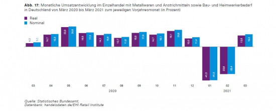 Im deutschen Baumarkthandel brach der Umsatz von Januar bis März 2021 nach vorläufigen Ergebnissen des Statistischen Bundesamts um preisbereinigt 16,3 Prozent ein. Nominal habe das Minus bei 15,6 Prozent gelegen, so die Statistiker. Im Januar lag der Umsatzrückgang sogar real bei 41,3 Prozent (nominal 41,0 Prozent), im Februar gab es ein Minus von real 33,6 Prozent (nominal 33,4 Prozent). Im März dieses Jahres hätten die Bau- und Heimwerkermärkte dann wieder ein Umsatzplus melden können, heißt es im Bericht weiter, der Wert kletterte auf nominal 15,0 Prozent. Bereinigt um die Verbraucherpreisentwicklung habe das Plus bei 13,6 Prozent gelegen. Einen Einfluss darauf hätten auch die durch Click & Collect erwirtschafteten Umsätze gehabt, unterstreichen die Macher der Studie.