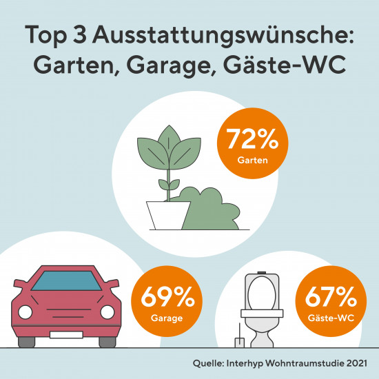 Die Immobilie bleibt einer der zentralen Ankerpunkte der Deutschen. Das geht aus der neuesten Wohntraumstudie der Interhyp AG hervor. Seit dem Jahr 2011 erfasst der Vermittler privater Baufinanzierungen die Wohnwünsche der Bundesbürger. Auf die Frage, was im Leben wichtig ist, antworten 99 Prozent der Befragten "Gesundheit", 97 Prozent "ein schönes Zuhause", 96 Prozent "Sicherheit im Alter" und 93 Prozent "Familie". Karriere, Freunde oder Erfolg im Beruf werden zum Beispiel weniger genannt.