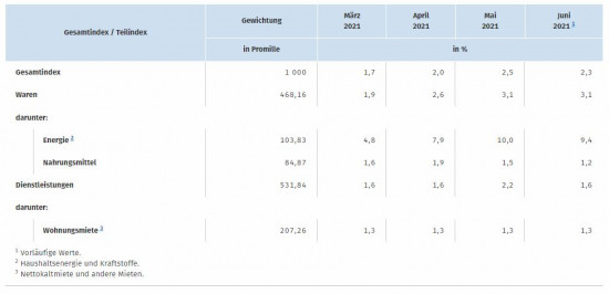 Die Inflationsrate in Deutschland, gemessen als Veränderung des Verbraucherpreisindex (VPI) zum Vorjahresmonat, wird im Juni 2021 laut Schätzungen des Statistischen Bundesamtes (Destatis) 2,3 Prozent betragen. Nachdem der Wert seit Dezember 2020 konstant gestiegen war (-0,3 Prozent, Januar 1,0 Prozent, Februar 1,3 Prozent, März 1,7 Prozent, April 2,0 Prozent und Mai 2,5 Prozent) befindet er sich nun wieder leicht im Abwärtstrend.