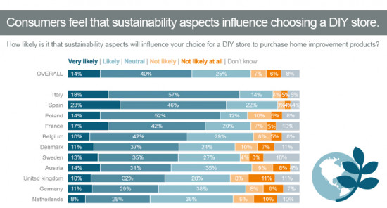 Beeinflussen Nachhaltigkeitsaspekte die Wahl der Einkaufsstätte von Baumarktkunden? Das hat die Marktforschungsgesellschaft USP Marketing Consultancy Verbraucher in elf europäischen Ländern gefragt – und als Ergebnis bekommen: Am häufigsten haben die Italiener angegeben, dass sie in ihrer Wahl sehr wahrscheinlich oder wahrscheinlich davon beeinflusst sind, ob das jeweilige Handelsunternehmen sich in Sachen Nachhaltigkeit profiliert. Auf Platz zwei folgen die Spanier. Schlusslicht bilden Deutschland und die Niederlande. Im europäischen Schnitt haben 14 Prozent mit „sehr wahrscheinlich“ und 40 Prozent mit „wahrscheinlich“ geantwortet. Allerdings weisen die Marktforscher ausdrücklich darauf hin, dass lediglich die Intention abgefragt wurde. Wenn es zum tatsächlichen Einkauf komme, würden viele Verbraucher die Wahl der Einkaufsstätte wohl eher nach dem Aspekt der Convenience als der Nachhaltigkeit treffen.
