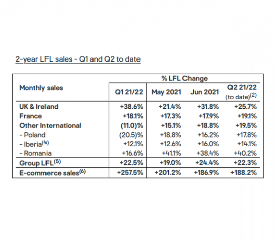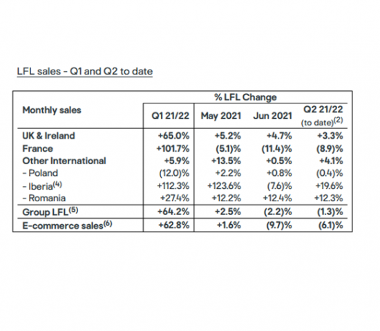 Ein Plus gegenüber 2020 meldet der Konzern für die knapp zweieinhalb Monate aus Großbritannien und Irland (3,3 Prozent), Rumänien (12,3 Prozent) sowie Spanien und Portugal (19,6 Prozent). In Frankreich dagegen lag das Umsatzvolumen um 8,9 Prozent unter dem entsprechenden Vorjahresniveau. In Polen gab es ein knappes Minus von 0,4 Prozent. Die Umsätze im E-Commerce sind um 6,1 Prozent gesunken.