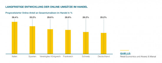 2019 machten Online-Einkäufe europaweit 12,1 Prozent der Gesamtumsätze aus, 2020 waren es 14,8 Prozent. Für das Jahr 2025 wird ein Online-Anteil von 20,4 Prozent erwartet. Das langsamste Wachstum unter allen Ländern sagt der Report für Deutschland voraus. In Großbritannien wollen 44,1 Prozent der Befragten den stationären Handel künftig seltener aufsuchen. Der Bericht geht davon aus, dass sich dort 33,5 Prozent des Umsatzes bis 2025 im Einzelhandel ins Internet verlagert.