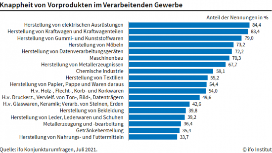Bei den Herstellern elektronischer Geräte beklagen 72,2 Prozent der Befragten Materialmangel, außerdem 70,3 Prozent der Maschinenbauer. Die stark gestiegenen Preise für Kunststoffgranulate machen den Herstellern von Gummi- und Kunststoffwaren deutlich zu schaffen (79 Prozent). Die Knappheit bei Halbleitern und Chips macht sich insbesondere bei den Herstellern elektrischer Ausrüstungen bemerkbar (84,4 Prozent).