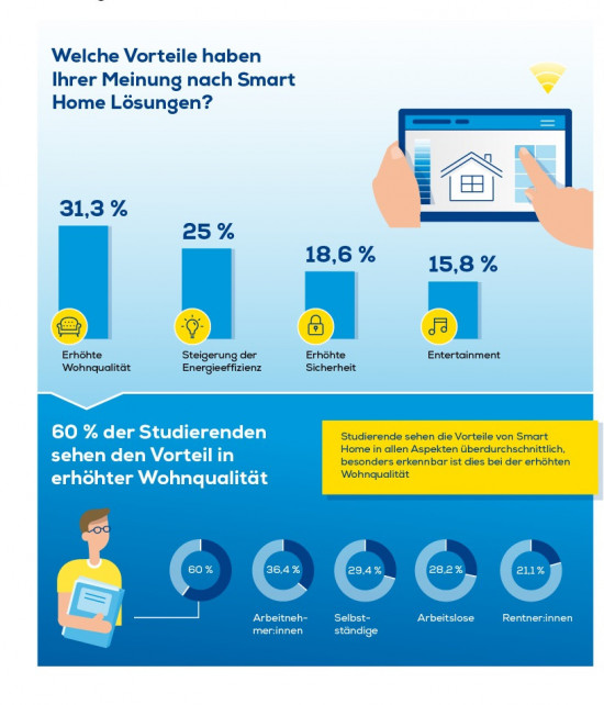 Der Wunsch nach mehr Komfort und Energieeffizienz und ein steigendes Umweltbewusstsein tragen dazu bei, dass die Techniken rund um ein vernetztes Zuhause in Deutschland immer beliebter werden. Das zeigt eine Studie von Euronics. Der Elektronikanbieter hat untersucht, was sich die Deutschen von Smart-Home-Techniken versprechen. Für 31,3 Prozent der Befragten ist demnach eine erhöhte Wohnqualität der entscheidende Faktor, gefolgt von dem Wunsch nach einer gesteigerten Energieeffizienz (25 Prozent). Nach wie vor scheint das Thema Digitalisierung in den Händen der Digital Natives und der Generation Z zu liegen. Während 60 Prozent der Studierenden den Vorteil einer erhöhten Wohnqualität in Smart-Home-Lösungen erkennen, sehen nur knapp 21 Prozent der Rentner einen positiven Nutzen. 57,8 Prozent der befragten Studierenden sowie 57,3 Prozent der Haushalte mit Kindern können sich außerdem einen Nutzen von Smart-Home-Anwendungen vorstellen; in durchschnittlichen Haushalten sehen dies nur 45,6 Prozent so.