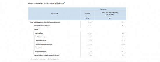 Während im Juni 2021 in Deutschland die Zahl der Baugenehmigungen im Neubau für Wohnungen in Mehrfamilienhäusern um 11,4 Prozent und in Zweifamilienhäusern um 1,7 Prozent gesunken ist, war laut dem Statistischen Bundesamt (Destatis) bei den Wohnungen in Einfamilienhäusern ein Anstieg um 7,1 Prozent zum Vormonat zu verzeichnen. Auch die Zahl der Genehmigungen für Wohnungen, die durch Baumaßnahmen an bestehenden Gebäuden entstehen, ist um 7,1 Prozent gestiegen.