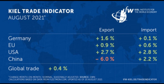Für Chinas Exporte zeigt der Kiel Trade Indicator des Instituts für Weltwirtschaft (IfW) für August 2021 mit einem Rückgang um 6 Prozent im Vergleich zum Vormonat (nominal, saisonbereinigt) eine negative Dynamik an. Ursache sind die neuerlichen Containerstaus. Der Indikatorwert für die Importe liegt bei +2,2 Prozent, aufgrund der hohen Volatilität in Chinas Handelszahlen deutet dies auf eine Stagnation hin. „Der Seehandel kommt nicht zur Ruhe. Zeigten sich in den vergangenen Wochen zarte Anzeichen einer Entspannung, verschärft die Terminalschließung in Ningbo die Engpässe im Containerverkehr nun wieder. Findet der Warenhandel mit China nicht schnell zurück zu normalen Abläufen, droht sich die Krise auch im Weihnachtsgeschäft mit fehlenden Produkten und höheren Preisen bemerkbar zu machen“, sagt Vincent Stamer, Leiter Kiel Trade Indicator. Insbesondere die Mega-Häfen Ningbo und Shanghai verließen in den vergangenen vier Wochen deutlich weniger Schiffe als in den vier Wochen davor. Allerdings war der Vergleichszeitraum besonders stark. Auch wegen der Schließung des Hafens Yantian liegt das Frachtvolumen im Roten Meer – der wichtigsten See-Handelsroute zwischen China und Europa – aktuell 20 Prozent niedriger, als unter normalen Umständen zu erwarten wäre.