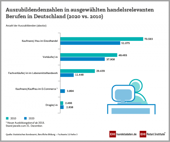 Im Aufwind ist dahingegen der 2018 neu geschaffene Ausbildungsberuf zum Kaufmann oder zur Kauffrau im E-Commerce. Die Absolventen dieser Ausbildung können in allen Unternehmen arbeiten, die Waren und Dienstleistungen online vertreiben. Bereits im Jahr 2018 gab es 1.338 Auszubildende in diesem neuen Berufsbild. 3.894 Personen waren es schließlich im Jahr 2020. Im Vergleich zum Vorjahr entspricht dies einem Wachstum von 44 Prozent (2019: 2.703).