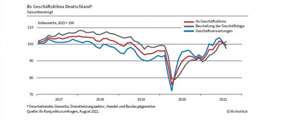 Die Stimmung in der deutschen Wirtschaft hat sich weiter eingetrübt. Der Ifo-Geschäftsklimaindex ist im August 2021 auf 99,4 Punkte gefallen, nach 100,7 Punkten im Juli dieses Jahres. Der Rückgang war laut dem Institut vor allem auf deutlich weniger optimistische Erwartungen der Unternehmen zurückzuführen. Lieferengpässe bei Vorprodukten in der Industrie und Sorgen wegen steigender Infektionszahlen belasteten die Konjunktur, berichten die Wirtschaftsexperten.