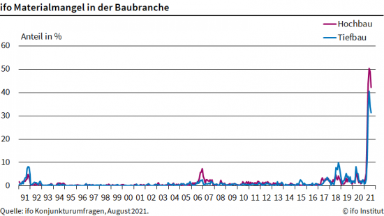 Der Materialengpass auf den deutschen Baustellen hat sich abgemildert. Das geht aus den Umfragen des Ifo-Instituts hervor. Im August gaben 42,2 Prozent der Unternehmen im Hochbau an, unter Materialknappheit zu leiden, im Juli waren es noch 48,8 Prozent. Auch im Tiefbau entspannte sich die Lage. 31,4 Prozent der Betriebe litten unter Lieferengpässen, nach 33,9 Prozent im Vormonat. „Die Flutkatastrophe im Juli hat aber örtlich neue Verwerfungen ausgelöst“, merkt Ifo-Forscher Felix Leiss an. Insbesondere aus Nordrhein-Westfalen seien im August Meldungen eingegangen, dass die Ereignisse den Materialmangel verschärft hätten, berichtet er. Trotz aller Verbesserungen bleibe die Versorgung insgesamt angespannt. „Viele Vorprodukte sind weiterhin knapp und teuer, insbesondere Dämmstoffe und Stahl. Eine gewisse Entspannung sehen wir beim Schnittholz, dennoch sind viele Holzprodukte nur schwer zu bekommen“, so der Experte weiter. Der Engpass treibe die Preise. „Viele Unternehmen, insbesondere im Hochbau, berichten von Preissteigerungen“, sagt Leiss.