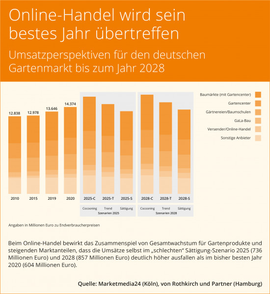 Während in Deutschland die Umsätze für Garden-Living, Gardening und Lebendes Grün von 2010 bis 2019 fast ununterbrochen im Jahresdurchschnitt um 0,7 Prozent stiegen, wuchs der Gartenmarkt 2020 um gut 5,3 Prozent. Der Onlinehandel legte dort deutlich zu. Allerdings bleibt der Distanzhandel mit 1,7 Prozent Marktanteil im Jahr 2010 und 4,2 Prozent im Jahr 2019 einer der kleineren Player. Nach Überzeugung von Marketmedia24 wird sich dessen überdurchschnittliches Wachstum auch nach Corona fortschreiben. Die übrigen Anbieter, insbesondere beratungs- und serviceorientierte Handelsformate, blicken optimistisch auf die kommenden Gartenjahre, in denen Themen wie Nachhaltigkeit und Digitalisierung angepackt werden müssten, betonen die Marktforscher.