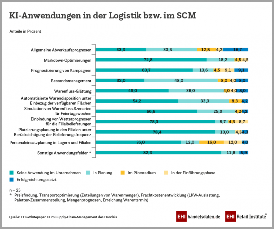 Künstliche Intelligenz (KI) gehört nach Ansicht des Handels kurz- und mittelfristig zu den zentralen Erfolgsfaktoren im Supply-Chain-Management, wie eine Studie zeigt, die das EHI im Auftrag der Relex Solution durchgeführt hat. 76 Prozent der Unternehmen bewerten KI als (relativ) wichtig. Dennoch steckten diese Anwendungen im Supply-Chain-Management mehr oder weniger in den Kinderschuhen, so das EHI. Die häufigste Anwendung, die Erstellung von Absatzprognosen, ist bei 16,7 Prozent der Studienteilnehmer bereits umgesetzt, gefolgt von Kampagnenprognosen (9,1 Prozent), Bestandsmanagement (8,0 Prozent) und Warenfluss-Glättung (8,0 Prozent). Alle übrigen Anwendungsmöglichkeiten bleiben unterhalb der Fünf-Prozent-Hürde. Gar nicht angewendet werden zum Beispiel Markdown-Optimierungen oder Wetterprognosen für die Filialbelieferungen.