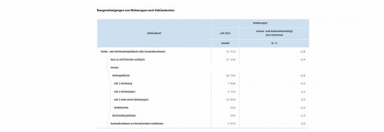Im Zeitraum Januar bis Juli 2021 wurden insgesamt 6,6 Prozent mehr Wohnungen genehmigt als im Vorjahreszeitraum. Dieses Plus betrifft im Neubau fast alle Gebäudearten (Einfamilienhäuser: 7,8 Prozent, Zweifamilienhäuser: 33,8 Prozent, Mehrfamilienhäuser: 1,9 Prozent), lediglich bei geplanten Wohnheimen gab es ein Minus.